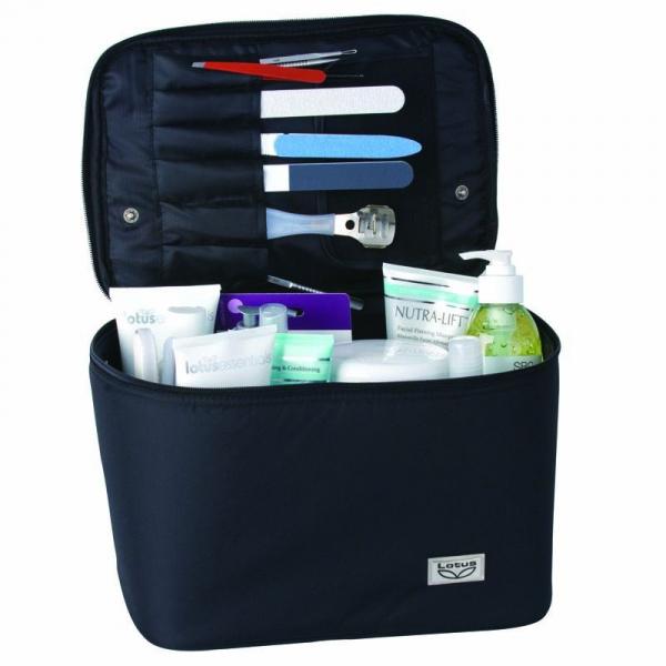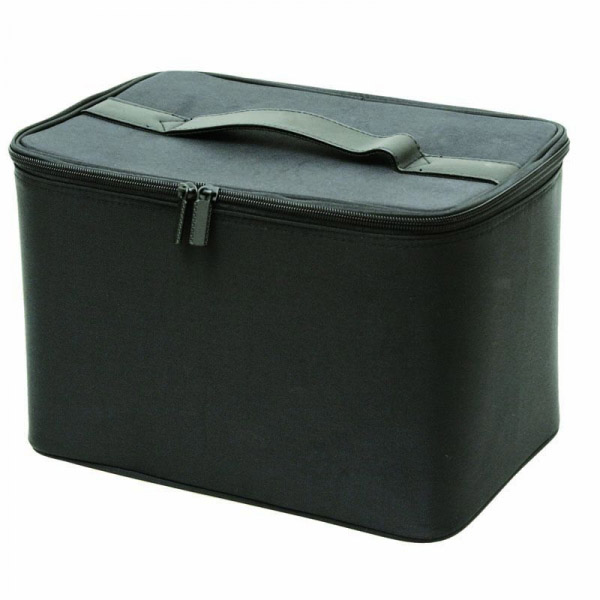 A black nylon vanity case with zip fastener. It has roomy compartments for all your accessories.